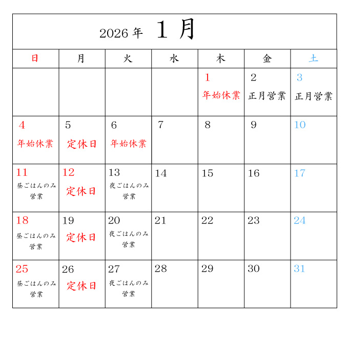 1月4日(日)~6日(火)に年始休業をいただき、7日(水)から通常営業となります。