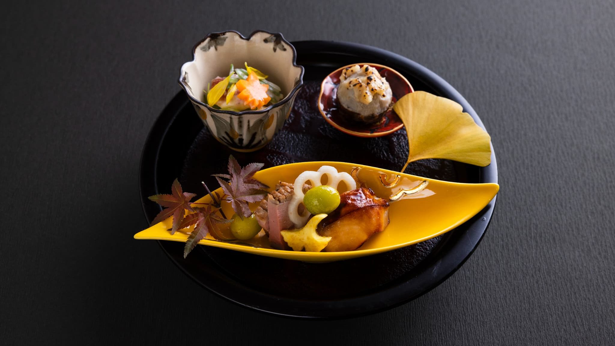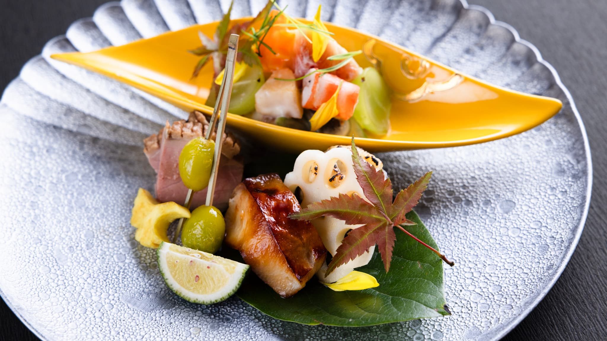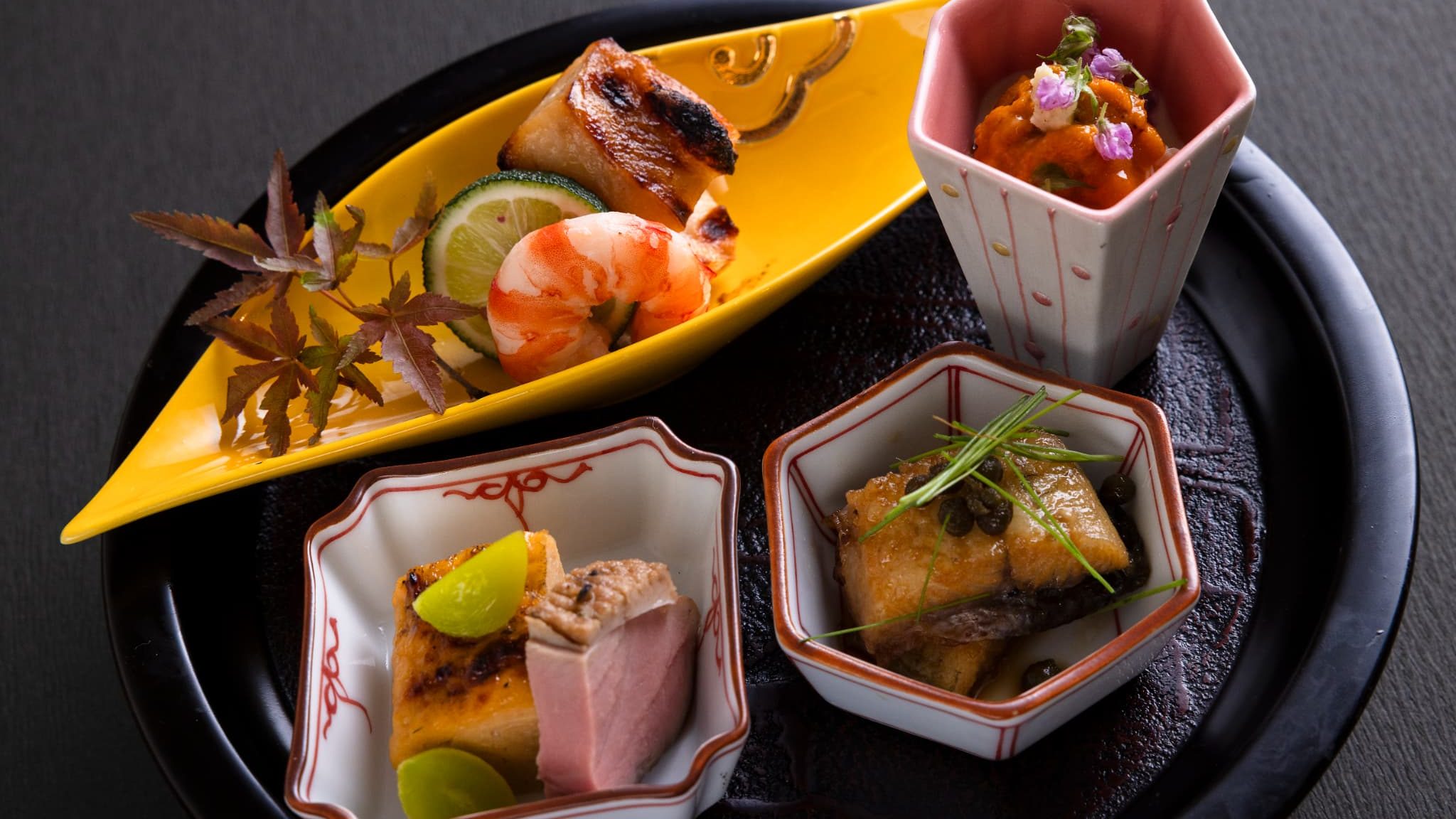一、旬彩玉手箱 上段に旬の肴を盛り合わせ